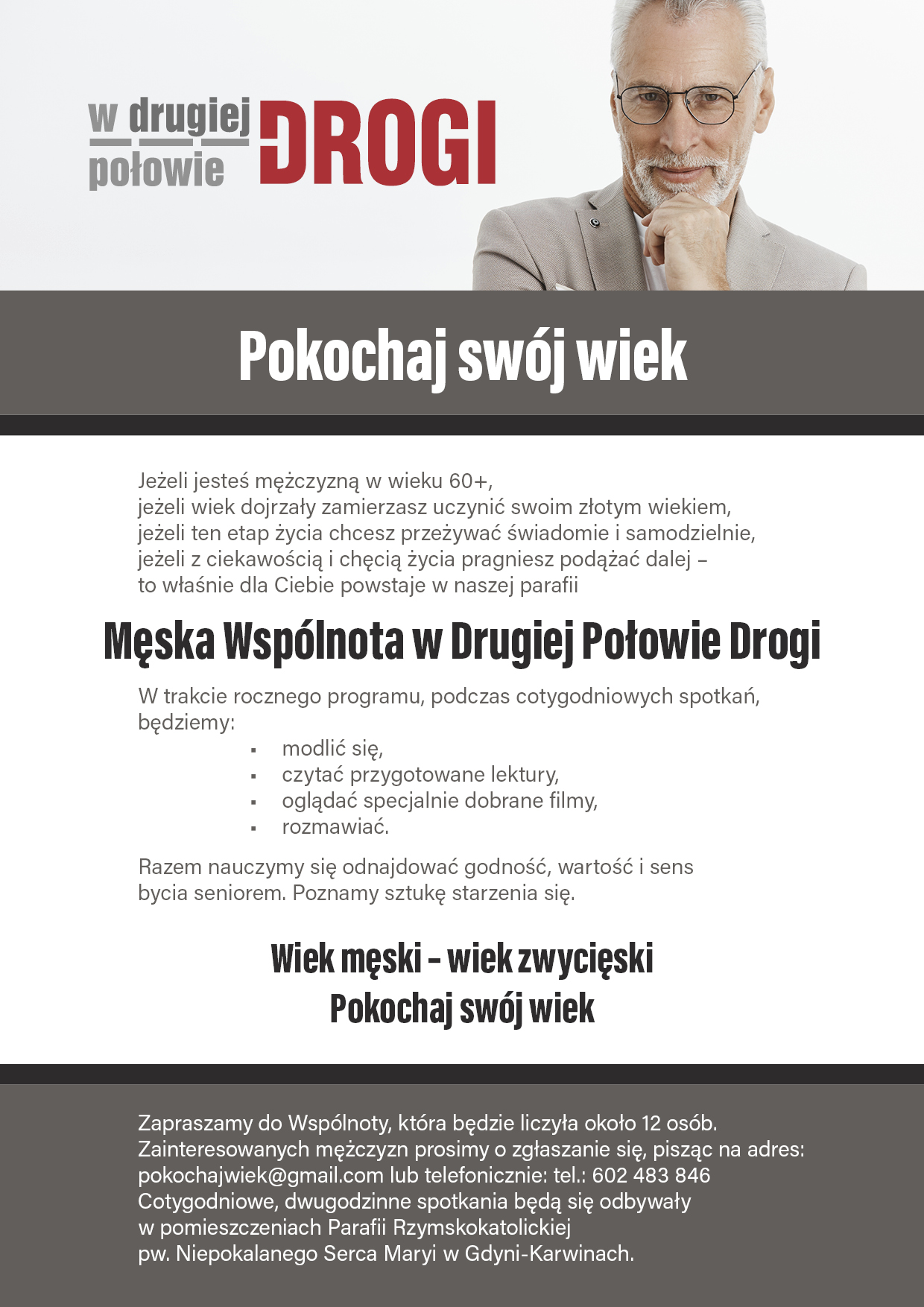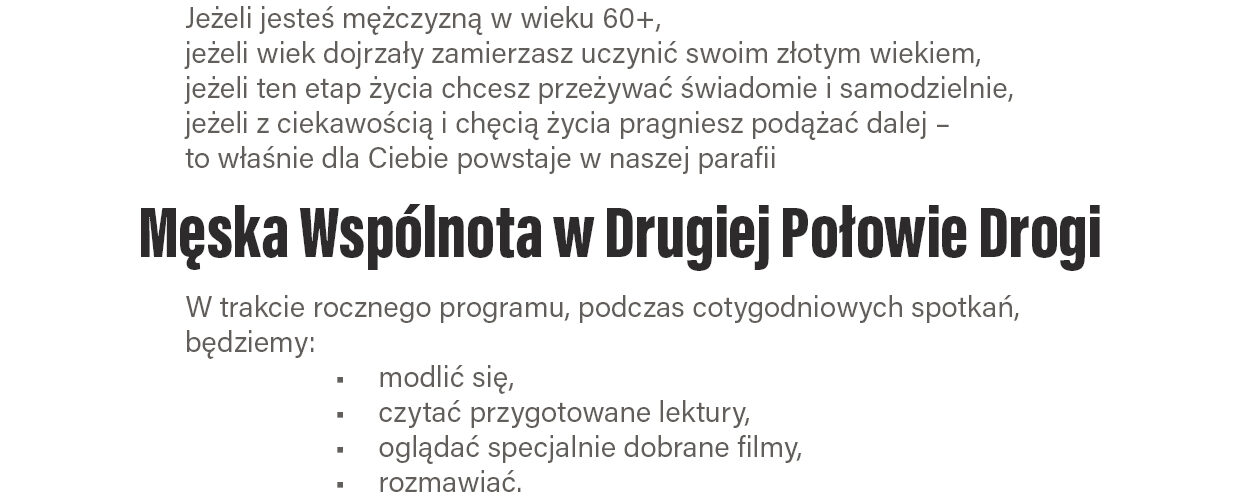 W naszej parafii rozpoczynamy tworzenie nowej wspólnoty formacyjnej, tym razem tylko dla mężczyzn – Mężczyźni w Drugiej Połowie Drogi, pod hasłem: „Pokochaj swój wiek”, skierowaną do mężczyzn w wieku 60+.